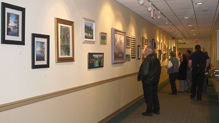 Attendees at the second quarter Art on the Walls show meander down the hallway at the Clark Fork Valley Hospital looking at the variety of paintings on display.