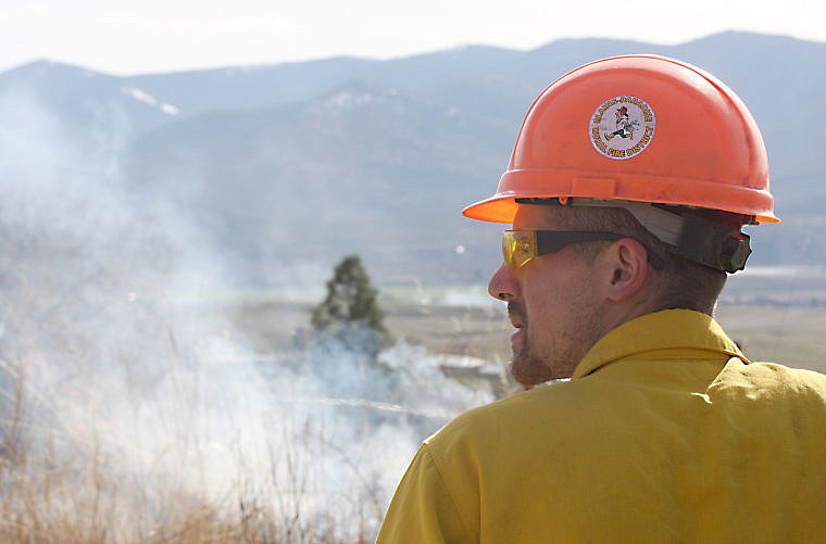 Mike Bowen oversees the burn, ensuring the fire remains in the perimeter created for it with the use of wet lines.
