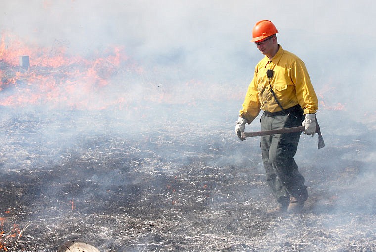 Kevin Osburn walks through the torched grass on the corner of Kruger and Upper Lynch Creek Road.