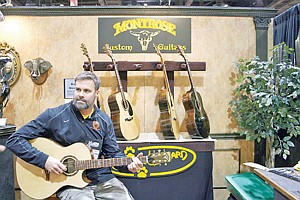 Local sculptor and guitar-builder Scott Lennard recently took some of his guitars to a Nashville, Tenn., convention, and one of the persons who stopped by the Lennard booth was country music artist Troy Gentry of the band Montgomery Gentry. Lennard, who is known for his bronzes, has been building high-end guitars for years now. In the photo above, Willmon was trying one of Lennard’s Montrose guitars.