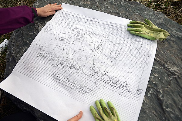 Shari Johnson lays out an architectural rendering of the future Wildcat Peace Garden on Friday, April 5, in Columbia Falls. (Brenda Ahearn/Daily Inter Lake)