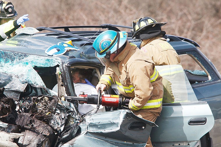 Kalispell firefighters extricate a man from his vehicle that was involved in a head-on collision Monday afternoon on US 93 Alternate south of Kalispell. April 8, 2013 in Kalispell, Montana. (Patrick Cote/Daily Inter Lake)