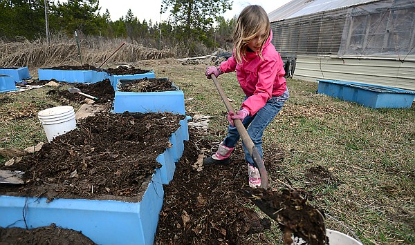 Maya Weller, 8, of Kalispell, on Saturday, April 6, at Purple Frog Organic Farm in Whitefish. (Brenda Ahearn/Daily Inter Lake)