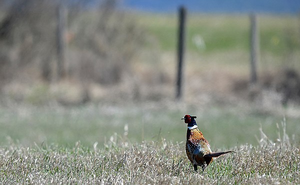 A rooster pheasant pops his head up from the grass on Tuesday afternoon, April 9, in Creston. (Brenda Ahearn/Daily Inter Lake)