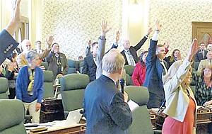 Montana Senate Democrats stand in protest on Friday, April 5, 2013, in Helena, Mont. Republicans ignored Democratic attempts to stall votes until all members are present, allowing key GOP-backed legislation to clear a procedural deadline. (AP Photo/Kathryn Haake)