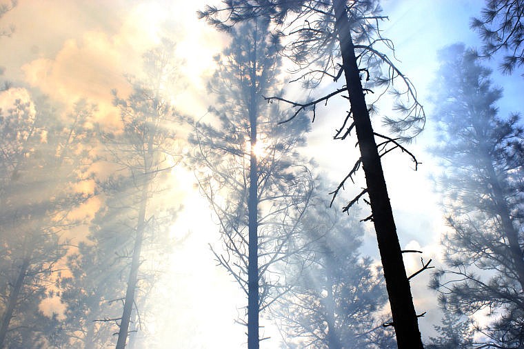 Sunbeams shine through smoke billowing from a prescribed fire set by a Forest Service burn crew near Swamp Creek on Tuesday. The effort was part of the Forest Service fire management plan.