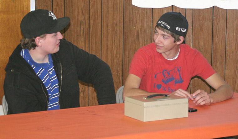Aaron Balantine and Dallas Burgess sit at the front table and collect money for the community dance.