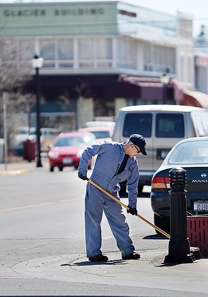 Paul Faessel sweeps the street along First Avenue East on Wednesday morning in downtown Kalispell. Faessel is the Downtown Ambassador for the Kalispell Business Improvement District. For the last four years Faessel has made the rounds from Second East to Second West and from Fourth Street up to Idaho cleaning up the downtown area. (Brenda Ahearn/Daily Inter Lake)