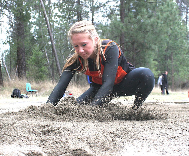 Hailey Philips lands in the sand pit at the end of the long jump competition. She placed second in the event.