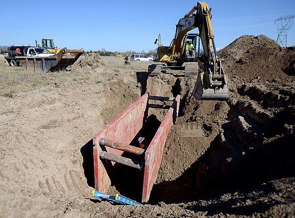 A crew works on the water lines that will service the new Cabela's on Tuesday, April 16, in Kalispell. (Brenda Ahearn/Daily Inter Lake)