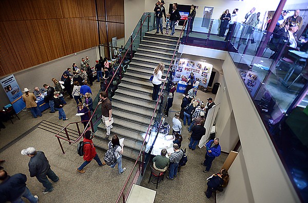 People make their way in and out of the Arts and Technology building on Thursday, April 18, at the Flathead Valley Community College Job Fair. (Brenda Ahearn/Daily Inter Lake)