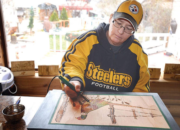 Dale Cordier-Homan works on a new wood burning of a pheasant recently at her home in Kalispell.