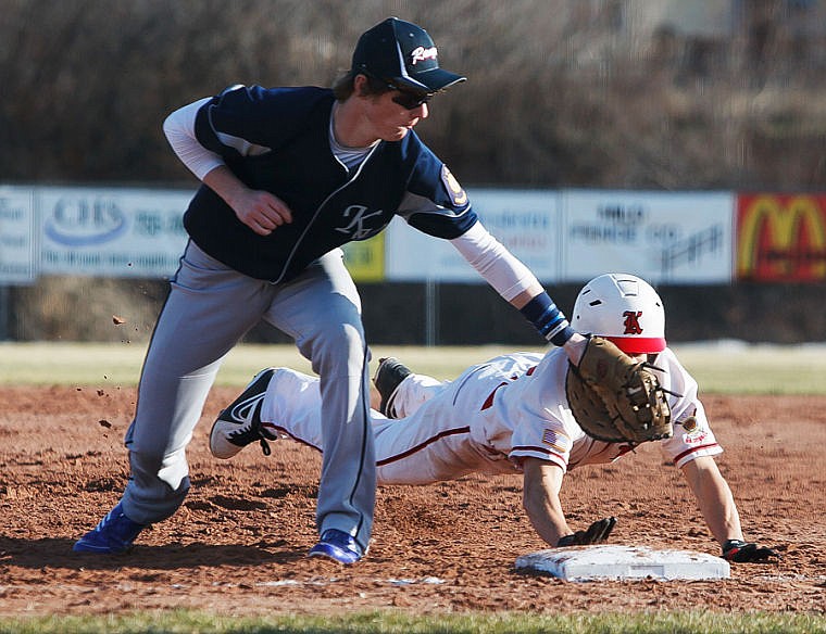 Kalispell's (right) Justin Wallace is picked off by Rangers first baseman #6 Tuesday afternoon during the Lakers' home opener against Kootenai Valley at Griffin Field. April 23, 2013 in Kalispell, Montana. (Patrick Cote/Daily Inter Lake)