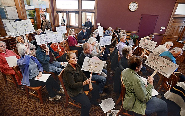 County Commissioner Gary Krueger, top left, steps out of the commissioners meeting room filled with senior citizens holding signs that read "Let the seniors be heard," and "We want AOA at Fairgrounds." Krueger and Commissioner Pam Holmquist later voted to stop a grant application to help fund a new Agency on Aging building.