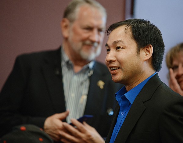 Phouxay Thepphavong of the Lao National Chamber of Commerce and Industry at the County Commissioner's on Wednesday, April 24, in Kalispell. In the background is Haley Beaudry, former external affairs manager for the Columbia Falls Aluminum Company. (Brenda Ahearn/Daily Inter Lake)