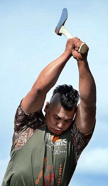 David Moses of Snoqualmie, Wash., competes with Brandon Sirguy of Port Angeles, Wash., at Murdoch's in Kalispell. The professional lumberjacks are part of the Stihl Timbersports Series.