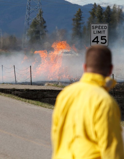 A firefighter watches flames flare up Friday afternoon at 2753 Helena Flathead Road. April 26, 2013 in Kalispell, Montana. (Patrick Cote/Daily Inter Lake)