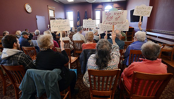 View of protesting seniors from the back of the County Commission meeting on Wednesday, April 24, in Kalispell. The meeting was filled with senior citizens holding signs that read "Let the Seniors be heard," and "We want AOA at Fairgrounds." (Brenda Ahearn/Daily Inter Lake)