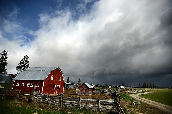 A red barn shines in a patch of sunlight as storm clouds pour into the valley on Monday morning, April 29, north of Kalispell. (Brenda Ahearn/Daily Inter Lake)