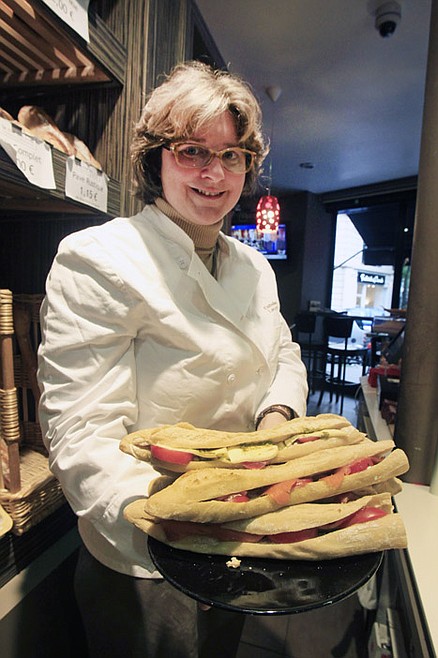 More than a third of her income is from the lunches, she said. Most of her customers grab a sandwich, a pastry and a drink and take off. A few linger at the handful of tables she set up facing the display cases containing pasta, quiches and desserts. The bread is there, of course, but it's tucked behind the counter.