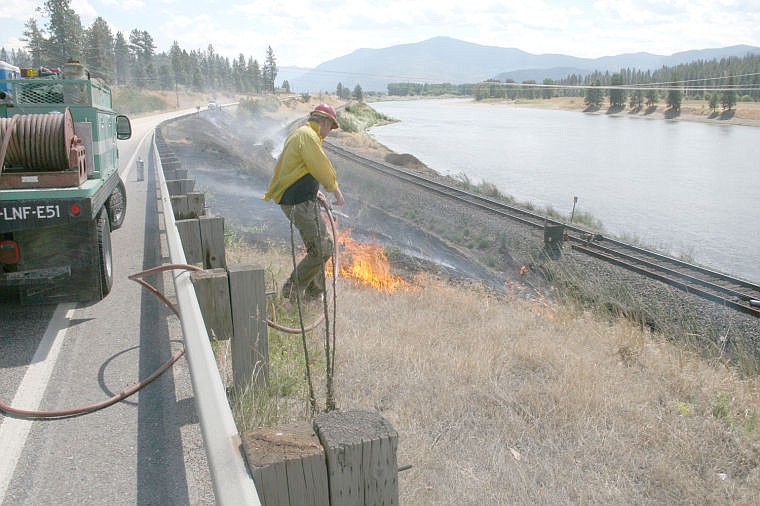 Jon Airhart, Forest Service official, fights a small grass fire on the side of Highway 200 Monday afternoon. The fire was quickly contained but shows that dry conditions still exist in the area.