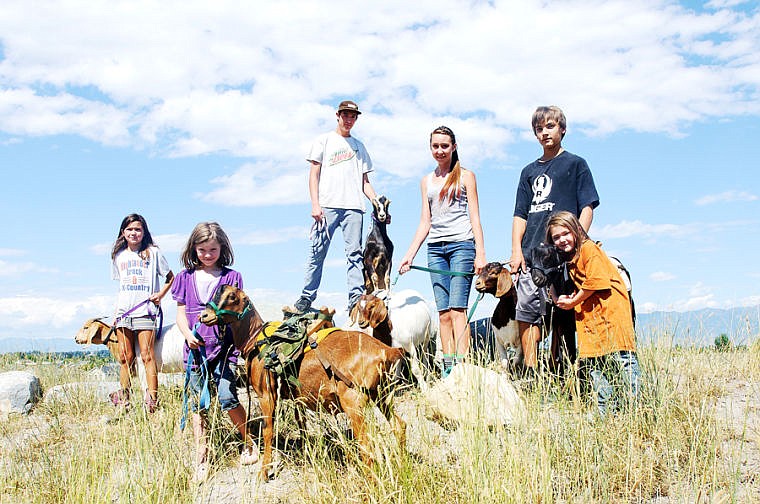 From left, Jaclyn Faulk, Kirra Turner, Tyler Faulk, Alexis Faulk, Riley Loff and Ally Turner pose for a picture with their goats at a ranch west of Kalispell.