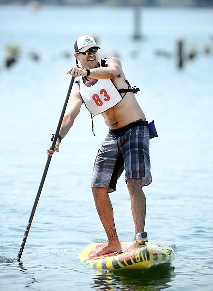 Chris Cochran of Missoula smiles as he crosses the finish line of the five mile race, part of the Epic Shore to Shore Race on Flathead Lake on Saturday, August 10, at the North Flathead Yacht Club in Somers. (Brenda Ahearn/Daily Inter Lake)