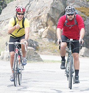Bart Klika, left, and Aaron Gingerelli approach the turnout on the Forest Development Road overlooking Libby Dam Saturday during their first climb of the third annual 83-mile Le Tour de Koocanusa.