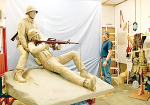 When complete, the statue of the soldiers will be placed atop six-foot-tall granite pillars. The entire monument, which will be 12-feet tall from the ground to the top of the standing soldier’s head, will be placed in the center of several rows of donated bricks at Riverfront Park. Each brick features the name, rank and unit of a soldier.