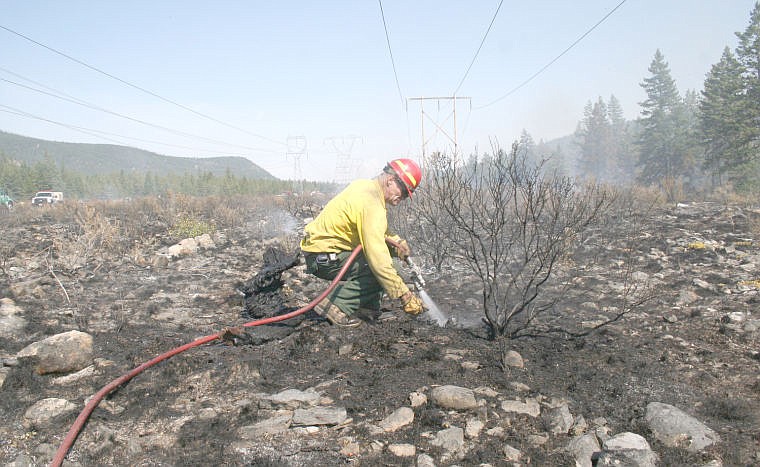 Marlin Cooper douses a hotspot with a hose at a fire near Dog Lake just north of Plains on Sunday.