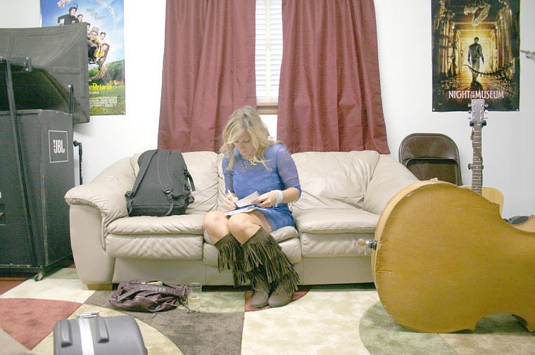Singer/songwriter Jeanne Jolly of Raleigh, NC prepares her set list before her performance at the Rex Theatre in Thompson Falls. Jolly is currently on tour in support of her debut full length album, "Angels."