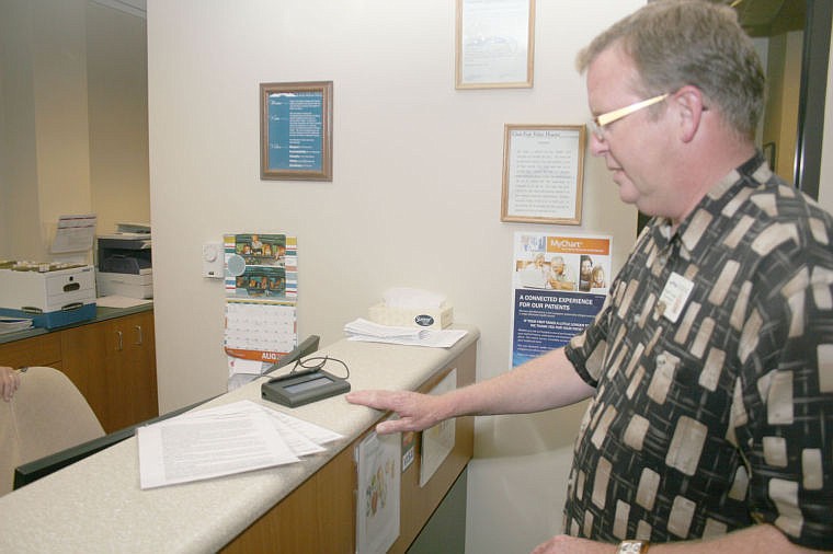 Russell Logan shows how patients will sign in electronically on the digital pad at the front desk.