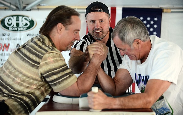 Arm Wrestling Referee Matt Phillips, center, demonstrates an arm wrestling match between Chuck Hurt, left, and Stan Watkins on Thursday, August 15, in Kalispell. (Brenda Ahearn/Daily Inter Lake)