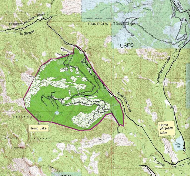 The project area is between Fitzsimmons Creed Road and Upper Whitefish Lake. Herrig Lake is within the work area.