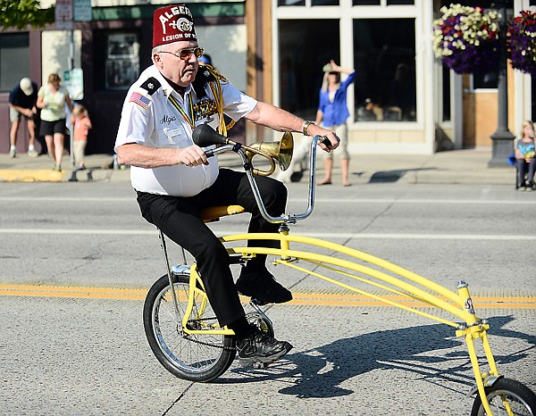 A member of the Legion of Honor of the Algeria Shrine out of Helena maneuvers his unique bicycle down Main Street.