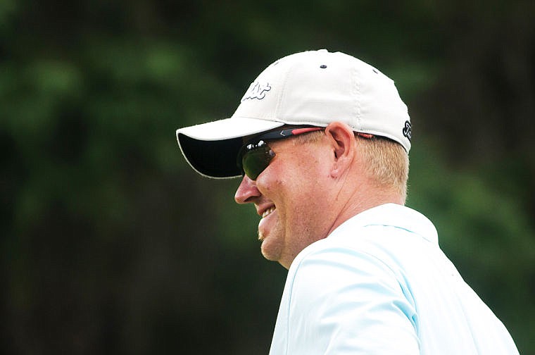 Logan Lindholm smiles after a tee shot Saturday afternoon on the final day of the State Mid-Am Tournament at Buffalo Hill Golf Club. Aug. 17, 2013 in Kalispell, Montana. (Patrick Cote/Daily Inter Lake)