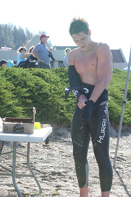 When he popped out of the water following the 2.4-mile swim Sunday morning, the crowd cheered and he was greeted with a hug from Brady Hooper, a Coeur d'Alene Area Swim Team coach.