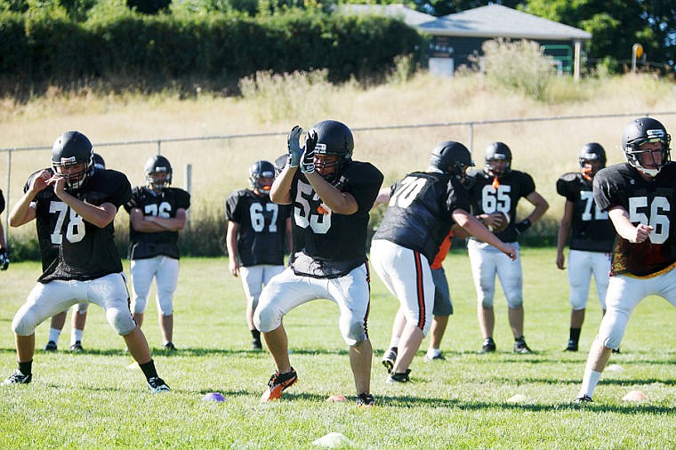 Lineman perform blocking drills Tuesday morning during Flathead's football practice at Legends Field. Aug. 20, 2013 in Kalispell, Montana. (Patrick Cote/Daily Inter Lake)