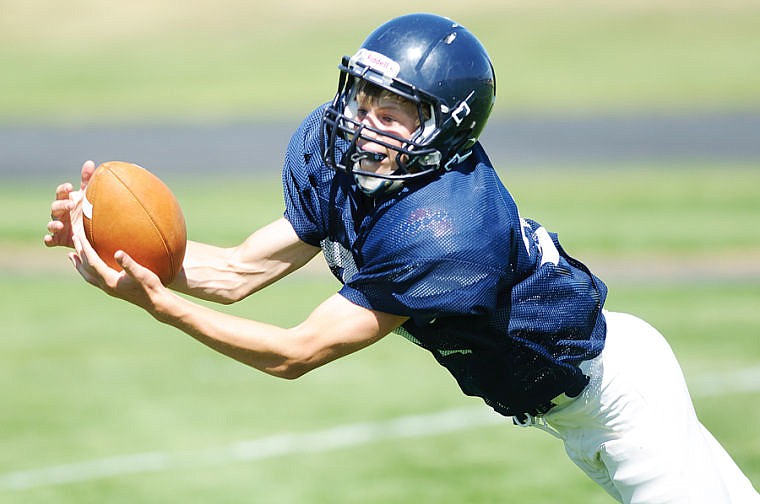 Sophomore Kaden Schoenthal dives for a catch Tuesday afternoon during Glacier's football practice at Glacier High School. Aug. 20, 2013 in Kalispell, Montana. (Patrick Cote/Daily Inter Lake)