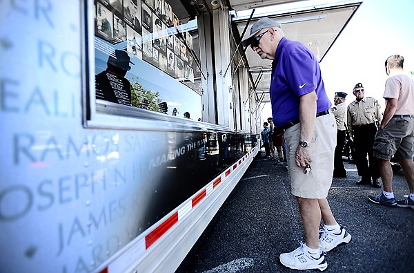 The Healing Wall, a traveling version of the Vietnam Veterans Memorial Wall stopped briefly in Polson on its way to Whitefish on Tuesday, August 20. Dave Swayne of Polson, a two tour Vietnam veteran with the U.S. Navy, was there to see the procession with his family. (Brenda Ahearn/Daily Inter Lake)