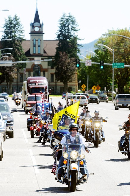 Approximately 60 motorcycle honor guards escort The Healing Wall, a traveling replica of the Vietnam Veterans Memorial, through downtown Kalispell on Tuesday afternoon. The wall will be set up at Grouse Mountain Lodge in Whitefish from Thursday through Sunday and open for public viewing 24 hours a day. Aug. 20, 2013 in Kalispell, Montana. (Patrick Cote/Daily Inter Lake)
