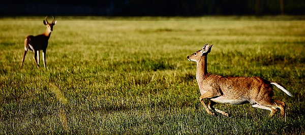 A pair of deer race across a field Wednesday morning north of Whitefish.