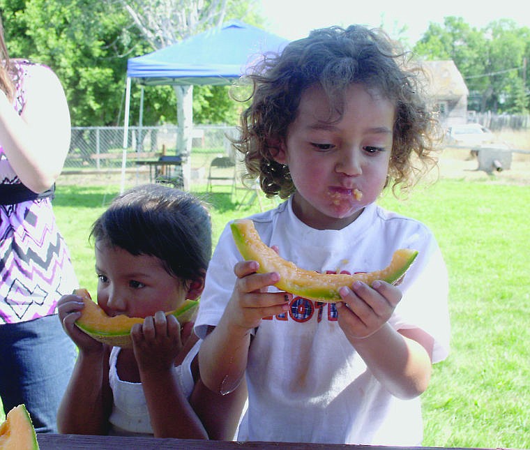 Keke Tenas, 4, and Kai O'Brien, 4, chow down on some melons during the annual melon eating contest at Dixon Melon Days.
