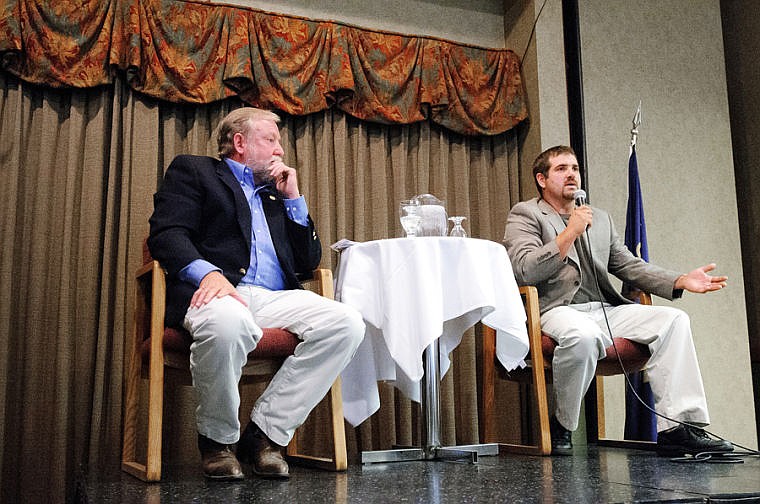 Jim Lynch, left, and Chad Graham discuss the future of the Kalispell City Airport on Tuesday afternoon during the Kalispell Chamber of Commerce's monthly luncheon at the Red Lion Hotel. Aug. 27, 2013 in Kalispell, Montana. (Patrick Cote/Daily Inter Lake)
