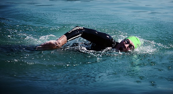 Steve Pleasants takes his final strokes on his swim from the north shore to City Beach on Monday, August 26, at City Beach in Whitefish. Pleasants swam the nearly 7 miles in 2 hours and 55 minutes on his 60th birthday. (Brenda Ahearn/Daily Inter Lake)