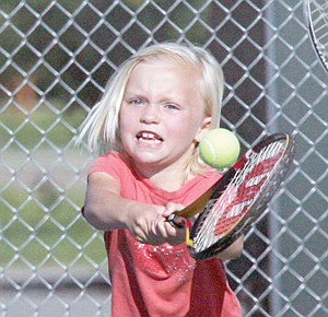 Troy's Kiara Thrasher, 6, works on her backhand Wednesday during summer tennis lessons at Libby's community tennis courts.