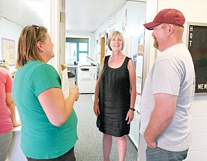 W. F. Morrison Principal Diane Rewerts, beginning her first year as the top administrator at the school, talks with Dawn and Michael Pattie during an open house Tuesday night at the elementary school. Rewerts isn’t the only new feature at the school, as a fresh exterior coat of Trojan school colors grace the walls of the school. Classes resumed the next day at W.F. Morrison, as they did in Libby.