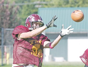 Receiver Pate Scott on a pass from quarterback Gabe Hickman during practice Tuesday afternoon.