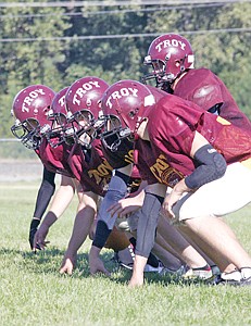 Troy's offensive line with Gabe Hickman at QB during practice Tuesday afternoon.