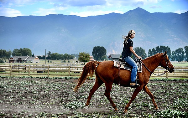 Jessica Lehman, 26, of Kalispell gives Scooter, a 14-year-old Polish Arabian, his daily ride on Friday, August 30, at Canter Creek in Columbia Falls. Lehman has had Scooter since Mother’s Day. Her grandfather rescued Scooter and another horse from an owner who could no longer care for them. Lehman says she and Scooter have already formed a close bond.